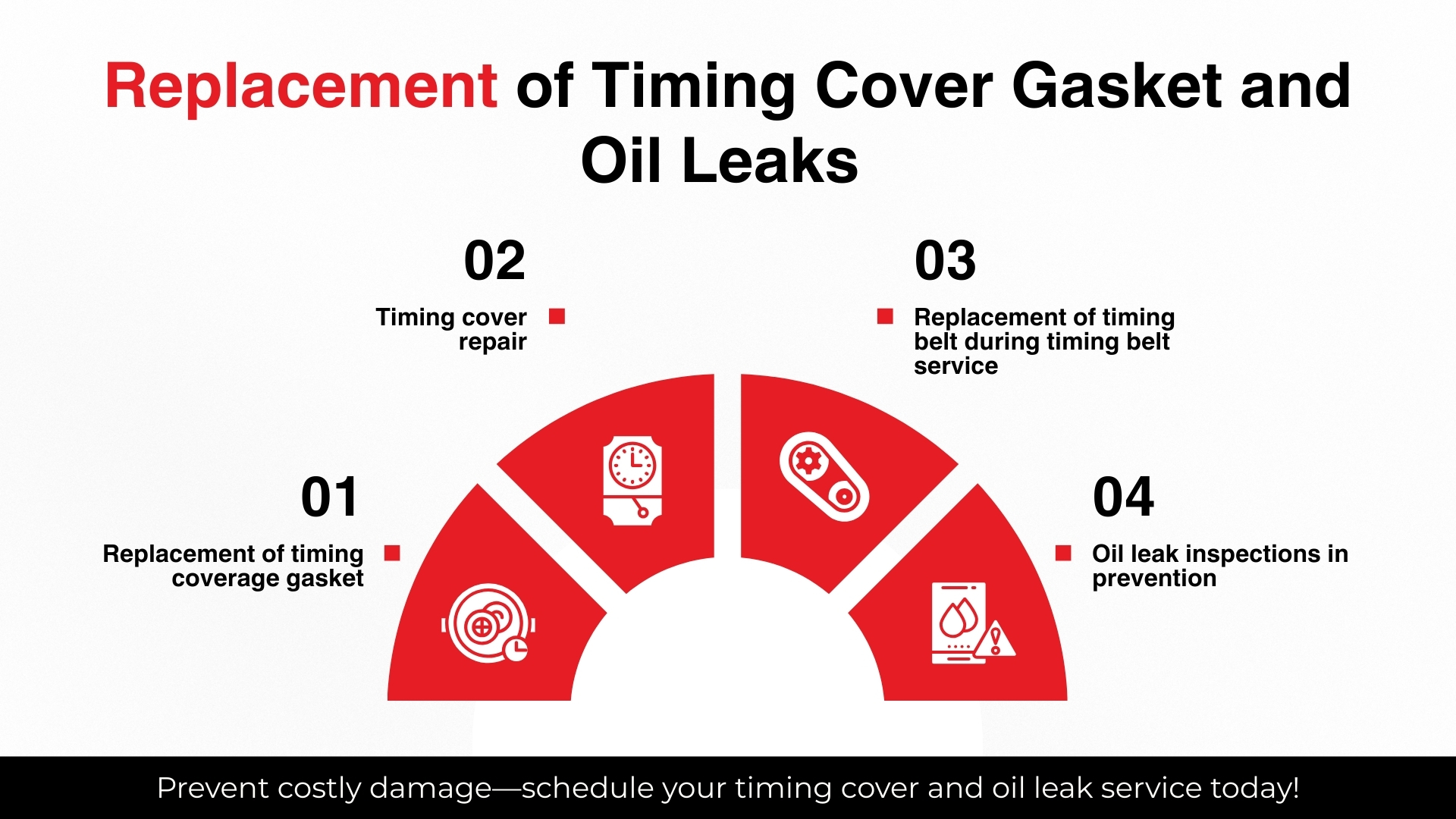 - Repairs of oil leaks associated with timing.