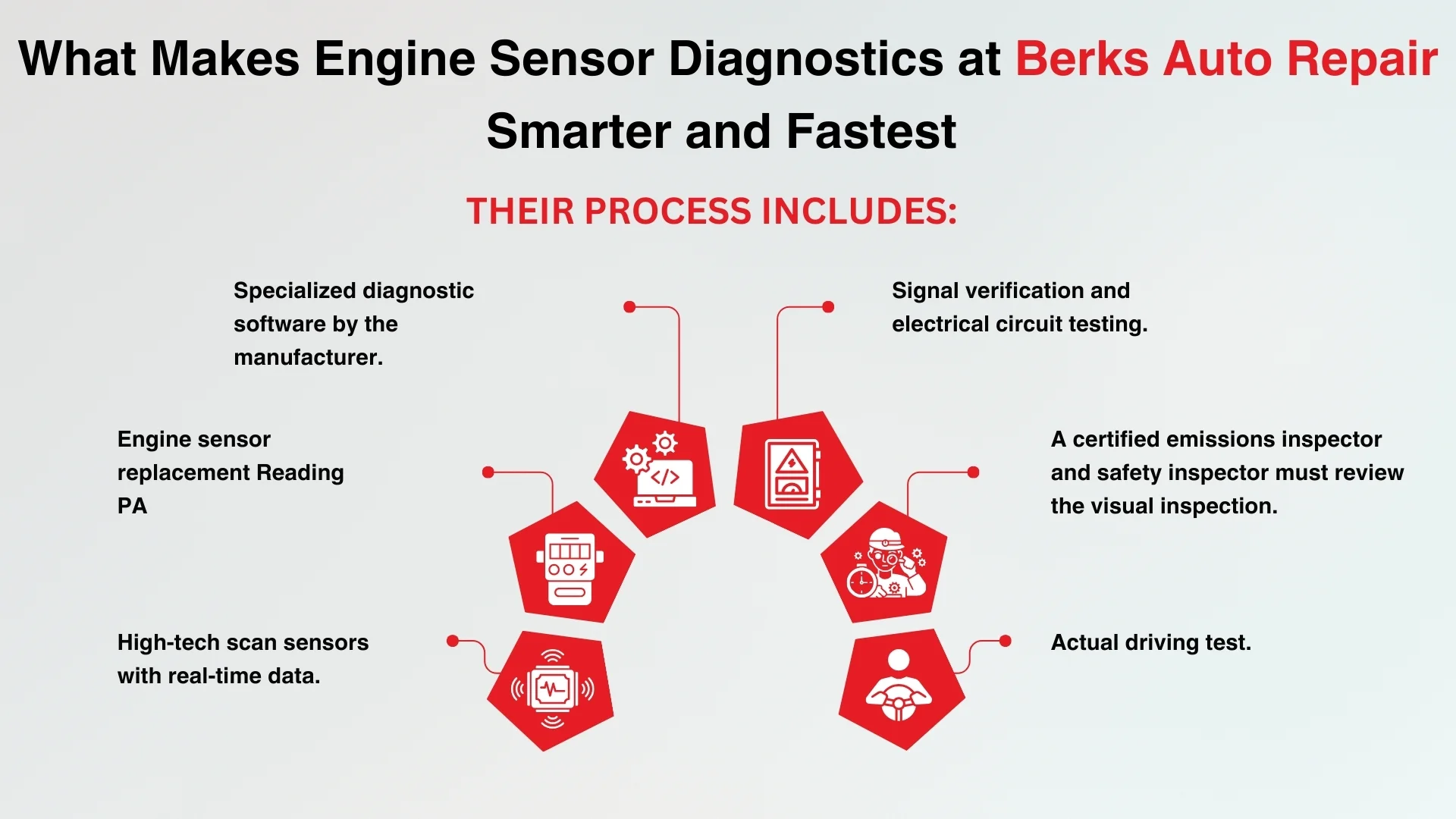 At Berks Auto Repair, a family-owned and trusted ASE-certified shop serving Reading, Pennsylvania, Berks County, PA and nearby communities, such as West Reading, Wyomissing, Shillington, Leesport, Muhlenberg, Exeter township, and Fleetwood, engine sensor diagnostics is accomplished quickest and correctly than at the majority of surrounding shops.